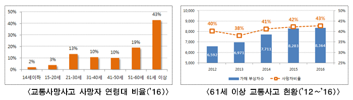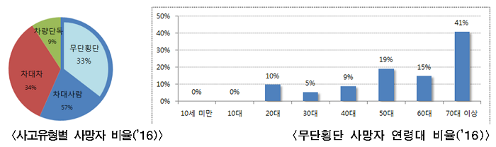 <교통사망사고 사망자 연령대 비율(’16)> <61세 이상 교통사고 현황(’12~’16)> 어르신의 경우에는 시력, 청력이 저하되고 인지 반응속도가 본인 생각보다 낮은 경우가 많아 안전운전에 특별히 유의해야 한다. 교통사망사고자의 57%가 보행자였고 교통사망사고 중 33%가 무단횡단으로 발생했다. 무단횡단 사망자의 경우에도 60대 이상 고령자가 56%에 달하는 만큼 어르신 보행자의 법규준수가 절실한 것으로 나타났다. 사망자는 차대 사람 사고 57%, 차대 차 34%, 차량 단독 9% 순이고 무단횡단 보행자사망자 중에서도 60대 이상 어르신 사망자 비율이 56%에 달하며 어르신의 경우에는 작은 충격도 치명적일 수 있기 때문에 무단횡단을 하지 않도록 본인과 주변 분들의 각별한 관심이 필요하다.