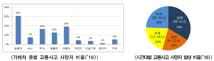 사망자 중 43%가 61세 이상 고령자, 교통사고 사망자의 57%가 보행자 서울시 “교통사고사망이 집중되는 겨울철 대비 시민의 방어운전, 안전보행 당부” 작년 한 해 서울시에서 발생한 교통사고의 특징을 분석한 결과, 겨울철 교통사고의 치사율이 높고 사망자의 43%가 61대 이상 고령자였고, 교통사고사망의 33%가 무단횡단으로 발생한 것으로 나타났다.