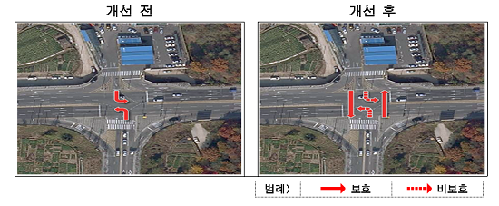 이에 따라 서울시는 지난 10.5(금) 궁동삼거리 신호를 변경, 온수방면→주말농장으로 향하는 ‘직진신호’을 주고 기존의 좌회전 신호는 비보호로 바꿔 주말농장과 가스충전소를 바로 진출입할 수 있도록 개선했다.