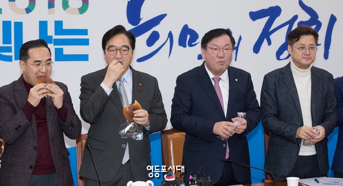 김태년, 권력기관 개혁방안에 대한 비판 조목조목 반박 16일 오전 국회에서 열린 더불어민주당 원내대책회의에 파리바게트 빵이 등장했다. 11일(목) 파리바게트 제빵사 문제가 노사, 가맹주의 합의로 잘 해결된 것을 축하하고 논란과정에서 20% 안팎의 매출이 줄어들어 어려움을 겪는 가맹주들을 응원하는 의미로 모두 발언에 앞서 빵 먹는 퍼포먼스를 선보였기 때문이다.