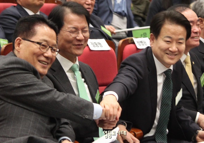 축사에 나선 정대철 상임고문은 “정당이란 것은 정치적 이념이나 철학이 비슷해야 한다”고 강조하고 “그러나 바른정당은 산업화 세대고 우리는 민주화 세대다”며 “저쪽은 쿠데타로 시작해 권위주의적 정권, 독재 정권을 이어간 사람들의 후예다”고 같이 할 수 없는 배경을 설명했다.