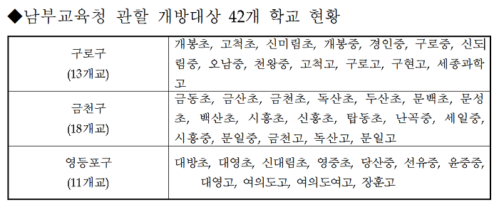 이번 주차시설 무료 개방은 영등포구, 구로구, 금천구 등 남부교육청 관내 공·사립 초·중·고 42개교가 참여한다. 남부교육청 관계자는 “개방 학교는 해당 자치구 주차 소요 사전조사 및 학교 자율적인 참여로 이루어졌다”고 전하고 “주차시설이 부족한 주택가에 거주하는 영등포구, 구로구, 금천구 주민의 주차난을 해소하고 부모, 형제 및 친지를 방문하는 역(逆)귀성객들의 주차 편의에 도움을 줄 것으로 기대한다”고 밝혔다.