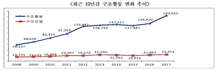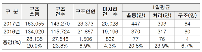 -전년대비 구조출동20.9%, 구조인원은6.9%증가 -계절별 재난 유형에 대한 기본적 안전상식 실천만으로도 안전사고 예방 가능 서울시 소방재난본부가 2월 23일(금) 오전 발표한 2017년도 구조 활동 현황에 대한 통계 분석결과에 따르면 화재, 교통사고, 승강기 사고 관련 구조요청의 증가로 전년 대비 구조출동이 20.9%, 구조인원은 6.9% 상승했다. 또한, 일일 평균 447건 출동하여 64명을 구조한 것으로 나타났다.