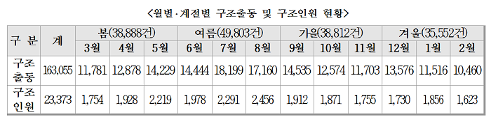 월별 출동은 7월 18,199건>8월 17,160건>9월 14,535건 순으로 계절별로는 여름부터초가을(6월~9월) 사이가 전체 구조출동의 39.5%로 가장 많았다. 이는 휴가철, 물놀이, 야외활동이 잦은 시기와 맞물려 있는 것으로 보인다. 구조 인원은 서울시 인구의 약 0.2%인 23,373명을 구조했으며, 성별로 남성(13,000명)이 여성(10,369명)보다 2,361명이 많았고, 연령별로는 20대(18.7%) > 30대(17.2%) > 40대(14.8%)순으로 많았다.