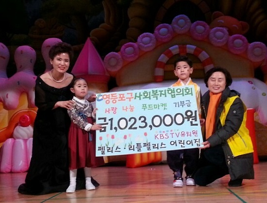 2월 21일(수) 영등포구 대림동에 있는 펠리스·리틀펠리스 어린이집 원생과 가족들은 구로구민회관에서 열린 학예회 발표에 앞서 저소득층과 소외계층을 위해 모은 성금 1,023,000원을 영등포구 사회복지협의회(회장 정진원)가 운영하는 영등포사랑나눔푸드마켓에 전달했다.