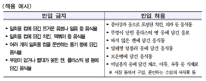 반면 종이상자 등으로 포장된 치킨․피자 등 음식물, 뚜껑이 닫힌 플라스틱 병 등에 담긴 음료, 따지 않은 캔에 담긴 음식물, 밀폐형 텀블러 등에 담긴 음식물, 보온병에 담긴 음식물, 비닐봉지 등에 담긴 채소, 어류, 육류 등 식재료와 시장 등에서 구입․운반하는 소량의 식재료 등은 들고 탈 수 있다.