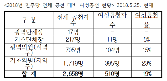 지역구 광역의원 공천자 705명 중 여성 후보는 104명(15%) 성폭력・성차별 근절을 위한 #metoo #with you운동에 대해 적극적 지지를 표명했던 민주당이 이번 6・13 지방선거 공직 후보검증과 공직 후보자 추천 과정에서 성범죄 관련 여부가 중요한 기준으로 자리 잡았다.