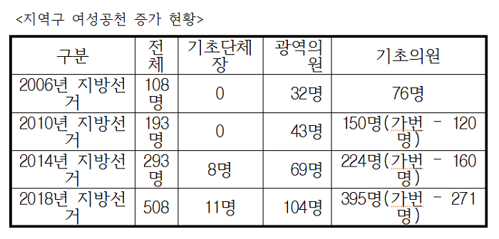 비례대표의 경우 광역비례 공천 80명 중 여성 공천 49명(61.3%), 기초비례 공천 400명 중 여성 373명(93.3%)을 공천하였다. 그러나 여성들의 정치참여 확대는 아직도 멀었다.