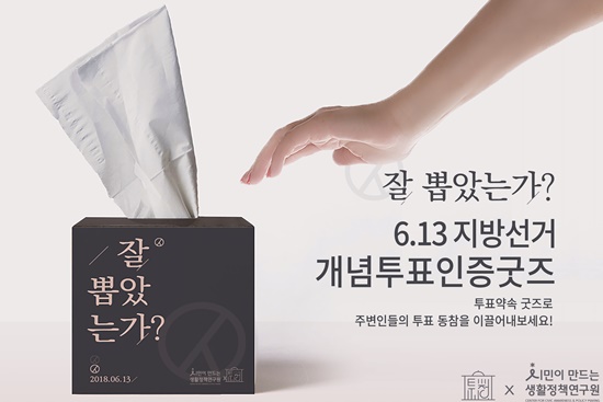 (사)시민이만드는생활정책연구원(이하 생정연)은 정치스타트업 TO.정치(이하 투정)과 공동으로 진행하는 이번 캠페인은 지방선거에 대한 적극적인 관심과 참여를 이끌기 위해 기획됐다. 지방선거 투표 독려 캠페인을 위해 투정이 특별히 제작한 ‘잘 뽑았는가?’ 휴지를 들고 SNS에 인증샷을 올리는 것으로 캠페인에 참여할 수 있다. 대선과 총선보다 지방선거에 대한 관심과 투표율이 낮다. 실제 중앙선관위에 따르면 2017년 대선 투표율은 77.2%에 달했지만, 2014년 지방선거 투표율은 56.8%에 그쳤다. 지방선거는 내 삶과 가장 밀접한 지역 일꾼을 선출하는 선거로 많은 관심과 참여가 필요하다. 하지만 지방선거에 대한 낮은 관심이 낮은 투표율로 나타나고 있다. 선거참여와 높은 투표율은 중요하다. 하지만 ‘잘 뽑았는가?’ 캠페인은 단순히 투표율을 높이기 위한 캠페인이 아니다. 출마한 후보들의 공약을 잘 살피고 지역과 내 삶을 변화시킬 수 있는 후보를 뽑자는 의미로 기획된 캠페인이다. 즉 ‘개념투표’ 캠페인이다. 생정연 황인국 공동대표는 “투정과의 캠페인 기획회의에서 “이번 지방선거를 통해 실제 내 삶이 바뀔 수 있도록 시민들이 꼼꼼히 후보들을 살피고 투표할 수 있는 계기가 되길 바란다”고 캠페인 취지를 밝혔다. 생정연과 투정은 이번 캠페인을 위해 5월 27일 오후 2시부터 서울 청계광장에서 진행되는 ‘정책프리마켓’에 별도 부스를 설치해 캠페인 홍보에 나섰다. ‘잘 뽑았는가?’ 캠페인과 관련한 휴지 및 굿즈는 텀블벅에서 구매할 수 있으며, 현재 판매목표 100% 이상을 달성했다. 굿즈 판매를 통한 소정의 수익금은 당선자가 공약을 지킬 수 있도록 다양한 캠페인을 진행하는데 활용할 예정이다. 생활정책연구원은 시민들과 밀접한 생활정책과 시민들의 목소리를 담아낸 법안을 제안하고 입법화를 추진하는 곳이다. 시민정책연구원은 ‘시민정책플랫폼 OPEN’과 ‘페이스북’을 통해 생활정책에 관한 시민의 제안을 받거나 의견을 수렴하고 이를 바탕으로 만들어진 정책과 추진 결과 등을 알리고 확산시키는 시민운동을 전개한다.