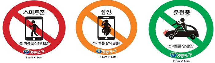 영등포구가 보행․운전 중 스마트폰 사용 금지를 위해 ‘보행안전 민관거버넌스’ 를 구축하고 캠페인 및 홍보활동에 적극적으로 나선다고 밝혔다. 민관 거버넌스 구축 및 홍보활동은 선도기관 선포사업의 하나로 추진되는 것으로 보행자 및 운전자 스스로 안전의식을 갖게 해 교통사고를 예방하는 데 그 목적이 있으며 영등포구청을 중심으로 영등포경찰서, 녹색어머니회, 모범운전자회, 지역기업(백화점, 대형마트) 등으로 구성되어 다양한 홍보활동을 펼쳐나갈 계획이다. 먼저 보행자가 많은 횡단보도 경계석에 홍보스티커를 부착한다. 홍보스티커는 ‘스마트폰 잠시 멈춤’ 등의 내용을 담고 있으며 차량신호등 색상에 맞춘 3색형 스티커로 제작됐다.