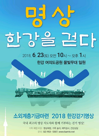 한국명사 지도자협회는 6월 23일 오전 10시부터 오후 1시까지 한강 여의도공원 물빛무대 일원에서 소외계층기금마련을 위한 ‘2018한강걷기명상’ 행사를 개최한다고 19일 밝혔다. 한강 여의도공원 물빛무대 일원에서 열리는 이번 걷기대회는 한강 변을 따라 약 3.3km를 1시간 동안 걷는 대회로 참가자가 걷는 만큼 적립되는 마일리지를 소외계층에 기부한다. 주최 측 관계자는 “참가자들에게 모자, 등산용 방석, 물, 빵 등을 제공한다”고 전하고 참가자는 선착순으로 마감한다”며 “서둘러 신청해 줄 것”을 당부했다. 참가신청은 전화 02-3666-0260번으로 하면 된다.