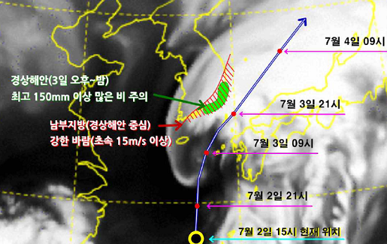 기상청은 2일 오후 태풍 ‘쁘라삐룬(PRAPIROON)’ 북상에 따른 영향으로 3일 오후부터 밤까지 경상해안 매우 강한 바람과 많은 비가 내릴 것으로 예상했다.