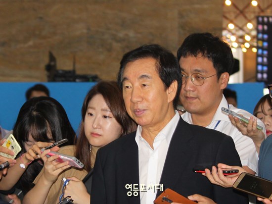 김성태 자유한국당 당대표 권한대행이 16일 오전 국회예결위 회의장에서 열린 의원총회에 참석하기 위해 회의장으로 이동하면서 기자들의 질문을 듣고 있다.