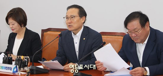 홍영표 원내대표(오른쪽 사진 가운데)는 24일 “북한이 미사일엔진시험장인 서해 위성발사장 해체에 착수한데 이어 어제 평양 인근의 ICBM 조립시설도 해체한 것으로 알려졌다”며 이같이 밝혔다. 홍 원내대표는 “비핵화를 위한 한미 동맹”을 강조하고 “지난 4.27 판문점선언에서 합의한 대로 정전협정 체결 65주년이 되는 올해 종전을 선언하겠다는 우리의 목표가 이뤄지기를 기대한다”고 밝혔다. 김선수 대법관 후보자에 대한 경과보고서 채택이 불발된 것과 관련 “김선수 후보자는 평생을 노동, 인권변호사로서 사회적 약자를 변론해왔으며, 대법관추천위가 3년 연속 후보자로 추천할 정도로 검증받은 분이다”고 강조하고 “그런데도 자유한국당은 김 후보자에게 이념편향성이란 낡은 잣대를 들이대면서 반대하고 있다”고 비판했다. 자유한국당은 김선수 후보자가 과거 청와대 비서관으로 재직한 경력을 문제 삼아 ‘3권 분립’의 정신에 위배된다며 경과보고서 채택에 반대하고 있다. 홍영표 원내대표는 이와 관련 “3권 분립의 정신을 무너뜨린 것은 지난 정권과 재판거래를 시도한 양승태 사법부이다”고 직격탄을 날리고 “김 후보자는 오히려 무너진 3권 분립의 정신을 바로잡을 수 있는 적임자이다”고 강조하고 자유한국당의 적극적인 호응”을 부탁했다. 홍영표 원내대표는 기무사 관계자들이 사후 보고 경위를 둘러싸고 진실공방을 벌이는 것과 관련 “계엄문건 작성과 기무사 개혁에 반대하는 조직적 저항이 아닌가 하는 의구심이 강하게 든다”며 “이번 사건의 본질은 기무사의 국헌문란, 내란음모 행위에 대한 철저한 진상 조사를 하는 것이다”고 강조했다. 홍 원내대표는 “계엄문건 작성자들은 책임을 회피하려는 말을 앞세우기보다, 진중한 자세로 수사에 먼저 임해야 한다”며 “국방부 특수단과 검, 군 합수단의 철저한 수사가 중요하다. 신속하고 철저한 수사로, 기무사 계엄문건 사건의 본질을 흐리려는 물타기 시도를 차단해야 한다”고 강조했다.
