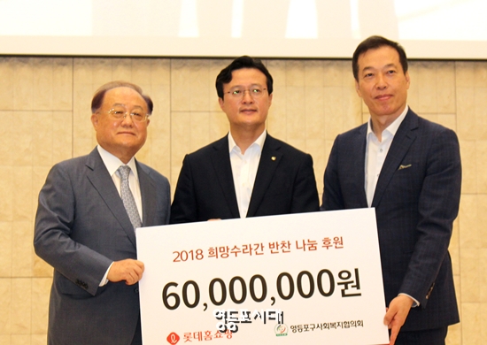 8일 영등포구사회복지협의회(회장 정진원)은 롯데홈쇼핑(대표 이완신)은 영등포구 소외계층 300명을 초청해 ‘사랑의 삼계탕’ 나눔 봉사를 진행하는 한편 롯데홈쇼핑은 영등포구사회복지협의회에 6000만원의 기금을 전달했다. 이날 전달된 6000만원의 기부금은 영등포구 소외계층을 위한 반찬 지원 사업인 ‘희망수라간’ 운영기금으로 사용될 예정이다. 이번 행사는 영등포구사회복지협의회 정진원 회장, 롯데홈쇼핑 이완신 대표이사, 더불어민주당 신경민의원, 채현일 영등포구청장 등 관계자들이 참석한 가운데 진행됐다. 정진원 영등포구사회복지협의회 회장은 “매년 영등포 관내 복지 소외계층을 위해 삼계탕 나눔 봉사를 해주는 롯데홈쇼핑 임직원에게 감사하다”며 “연일 계속되는 폭염 속에 어르신들이 더위를 이기는데 작은 보탬이 되길 바란다”고 전했다.