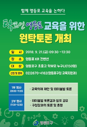 영등포구(구청장 채현일)가 구민이 체감하는 영등포구만의 교육지원 정책을 수립을 위해 ‘탁 트인 영등포 교육을 위한 원탁토론’을 개최한다.