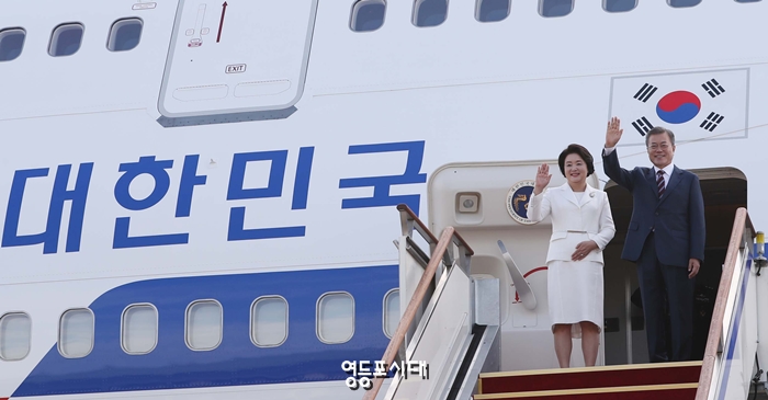18일 오전 문재인 대통령과 김정숙 여사가 서울공항에 도착해 제3차 남북정상회담을 위해 북한으로 출발할 전용기에 탑승, 배웅 나온 관계자들에게 인사를 하고 있다. ©제3차 남북 정상회담 공동취재단