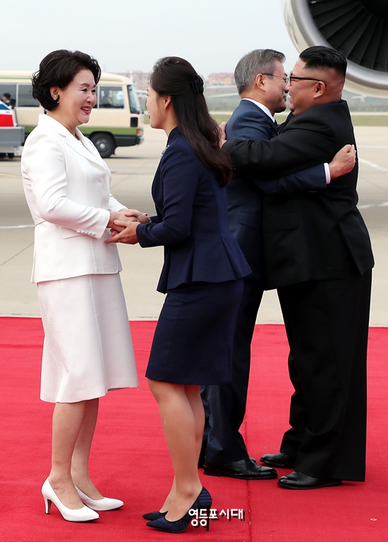 문재인 대통령과 김정숙 여사가 18일 평양에 도착해 북한 김정일 국방위원장과 퍼스트레이디 이설주의 환영을 받고 있다. ©평양 사진공동취재단