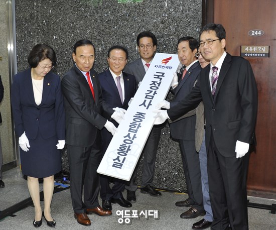 자유한국당은 8일 국회에서 국정감사 종합상황실 현판식을 열고 국정감사에 임하는 각오를 밝혔다.