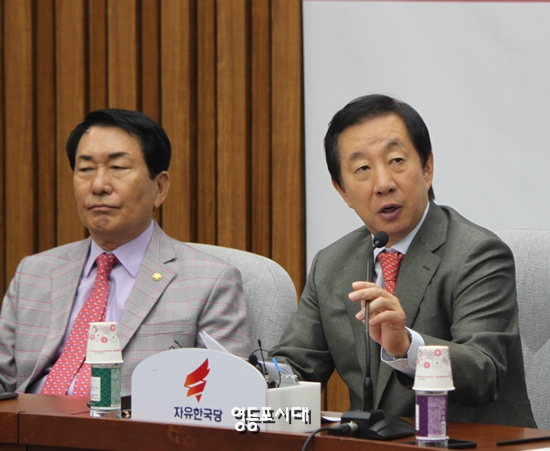 김성태 원내대표(사진 오른쪽)는 “허수아비 장관들을 내세워 국민들에 대한 책임과 도리를 회피하려는 문재인 정권에 다시 한번 깊은 유감을 표하지 않을 수 없다”며 이같이 비판했다. 김 원내대표는 유은혜 장관과 국방부, 산업통상자원부, 고용노동부, 여성가족부 등 신출내기 장관들을 내세워 국민 앞에 어떤 책임 있는 답변을 하겠다는 것이냐“뭐 ”야당은 반드시 문재인 실정과 정책실패의 책임을 분명하게 물어갈 것이다”고 밝혔다. 평양 방문 당시 “국가보안법을 재검토 하겠다”고 밝힌 이해찬 민주당 대표의 발언에 대해서도 서울에 와서 한 발짝 슬쩍 뒤로 물러나는 모습을 보였다“고 비판하고 ”그렇다면 도대체 뭘 어떻게 하겠다는 것인지 분명히 말씀해 주기 바란다”며 이해찬 대표의 입장 표명을 촉구했다. 문재인 대통령이 이번 주말부터 7박 9일간 유럽순방에 나서는 것에 대해서도 비판의 날을 세웠다. 김성태 원내대표는 “대정부질문 기간에는 장관들 대동하고 평양에 가 계시더니 국정감사 기간에는 유럽에 가 계시겠다고 한다”면서 “가실 때 가시더라도 국정감사 받아야 할 장관들은 반드시 남겨 두고 다녀오시기 바란다”며 에둘러 비판했다.