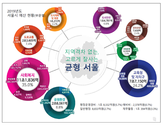 서울시가 2019년 예산(안)을 역대 최대 규모인 35조 7,843억 원으로 편성, 11월 1일(목) 서울시의회에 제출했다. 올해 첫 30조를 돌파한 데 이어 올해보다 12.5%(3조 9,702억 원) 증가한 규모로 최근 8년 중 증가폭이 가장 크다.