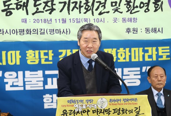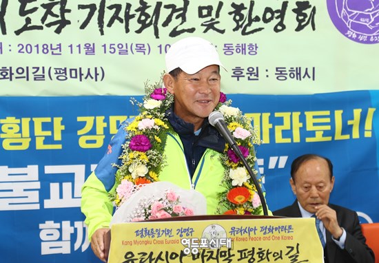 이장희 상임대표는 “강명구 유라시아횡단 선수의 동해항 일시 귀국은 마지막 구간인 평양구간 통과를 준비하기 위한 재충전의 기간이다”고 강조하고 “반드시 남겨놓은 마지막 구간인 북녘땅을 밝으려고 중국 단둥으로 다시 넘어가서 신의주-평양-개성-DMZ를 통과하고, 출발지 서울 광화문 세종대왕상 앞에 우뚝 설 것을 확신한다”며 이번 16개국의 질주는 북녘땅의 질주를 통한 평화의 꽂을 피우기 위해서였다는 점을 숨기지 않았다. 이 상임대표는 “인간의 힘으로 지구의 반 이상을 두 발로 걸어서 70년 이상의 조국분단극복 필요성과 한반도 평화를 지키기 위하여 발이 닿는 곳마다 한반도 평화를 외쳤다”며 “그는 대한민국의 민간 평화의 전권 특명 전권대사이다”고 강명구 평화 마라토너가 온몸으로 세세에 던진 평화의 메시지를 강조했다.