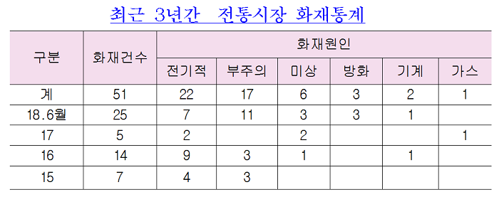 현재 매설 식 시민자율소방함을 시범 설치한 지역은 종로, 중부, 용산, 동대문, 영등포소방서 관내 쪽방과 전통시장 등이다. 최근 3년간 전통시장 화재는 18년 6월 말 현재까지 총51건이 발생했으며, 화재 원인별로 전기적 22건, 부주의 17건, 미상 6건, 방화 3건 등의 순이다.