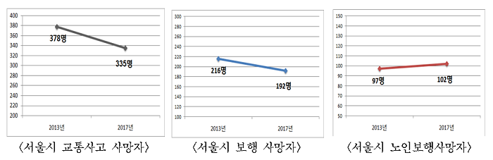 또 서울시 전체 보행사망자 중 65세 이상 노인 비율도 2013년 44.9%(97명/216명)에서 2017년 53.1%(102명/192명)로 많이 증가해 노인 보행사고 방지 노력이 더욱 중요해졌다.