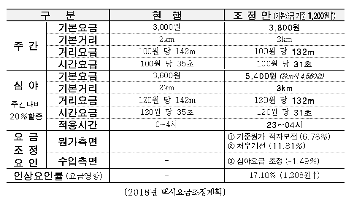 성중기 서울시 의원은 택시서비스 개선을 통한 시민 편의 증진을 우선 고려해 줄 것을 서울시에 주문하고 주간 기본요금 800원 인상, 야간 기본요금 1,800원 인상을 골자로 하는 서울시의 ‘택시요금 인상 조정안’에 반대한다고 밝혔다. 최근 서울시는 2013년 택시요금 인상 이후 물가상승, LPG 가격인상, 최저임금 증가 등 택시 운송원가 상승요인이 다수 발생했다는 점과 택시종사자 처우 개선 및 택시서비스 개선을 명분으로 주·야간 기본요금을 비롯해 시간요금과 거리요금을 인상하는 ‘택시요금 인상 조정안’을 발표하고, 서울시의회 의견청취 절차를 거쳤다. 서울시에서 제출한 택시요금 인상 조정안은 주간요금 25%, 심야요금 50%인상을 주요골자로 거리요금 및 시간요금을 조정하여 주간 10km, 25분 운행기준 현행 12,900원에서 14,700원으로 약 14%요금이 인상되는 것으로 나타났다. 서울시에서 제출한 인상안에 의하면, 주간 이용시 기본요금은 현행 3,000원에서 3,800원으로 800원(약 27%) 인상되며, 거리요금은 100원 당 142m에서 132m로, 시간요금은 35초당 100원에서 31초당 100원으로 높아진다. 야간의 경우 기본요금은 현행 3,600원에서 5,400원으로 1,800원(약 50%)인상되며, 거리요금은 주간과 마찬가지로 100원 당 142m에서 132m로, 시간요금은 35초당 100원에서 31초당 100원으로 높아진다. 특히 야간 할증시간대가 현행 0시~4시에서 23시~4시로 대폭 늘어나면서 실제 체감하는 요금인상폭은 더욱 클 것으로 보인다.