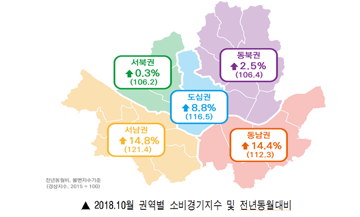 소비경기지수는 모든 권역에서 증가한 것으로 나타났다. 소비경기는 서남권이 가장 호조를 보였고 뒤이어 동남권, 도심권, 동북권, 서북권 순으로 호황을 보였다.