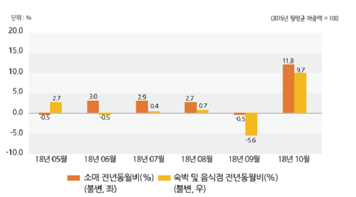업종별 지수를 살펴보면 소매업은 음식료품·담배와 연료를 제외한 전반에서 소비가 늘어나면서 전년 동월 대비 11.8% 증가한 것으로 조사됐다.