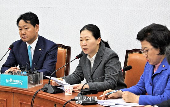 권은희 정책위의장(오른쪽 사진 가운데)은 “11월 5일 대통령이 직접 마련한 ‘여야정 상설협의체’에서 탄력근로제 기간확대를 합의한 것은 ”이를 국민과 약속한 것이다”고 강조하고 문재인 대통령과 민주당, 김태년 정책위의장을 싸잡아 비판했다.