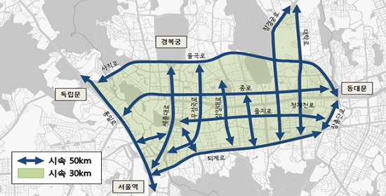 내년부터 서울 도심 사대문 안 운전자는 간선도로 50km/h, 이면도로 30km/h로 이하로 달려야한다.