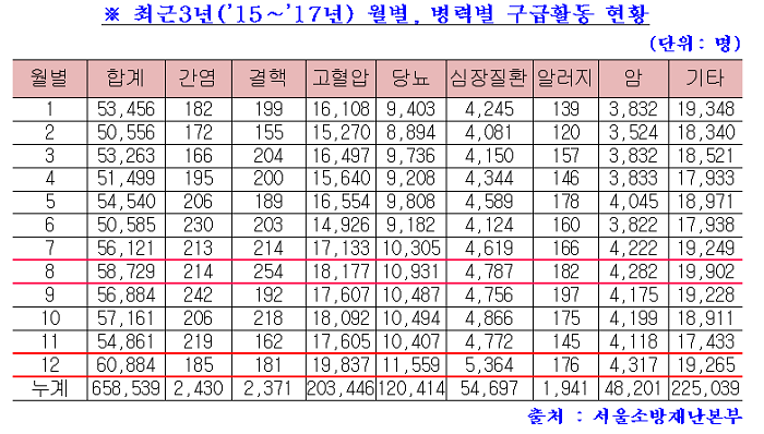 서울시, 질환별 구급활동 통계 발표 최근 3년간 119구급대는 1,579,975건을 출동 했으며, 이송환자 수는 952,202명으로 연평균 317,400명, 일일평균 869명을 이송했다. 또한 구급출동 건수는 ’15년 506,546건, ’16년 528,247건, ’17년 545,182건으로 매년 증가하고 있다.