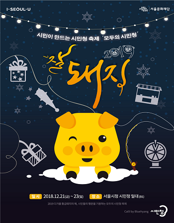 서울시는 21일(금)~23일(일) 시민청 일대(지하1층)에서 60년 만에 돌아온다는 황금돼지해에 시민들의 모든 일이 잘 되자는 의미를 담아 이와 같은 내용으로 「모두의 시민청-잘돼지 2019」를 개최한다고 밝혔다. 시민청 방문 시민 누구나 전시·체험·공연을 무료로 즐길 수 있다. 시민기획단 4개 분과(광장‧소통‧공감‧동행)에서는 시민들이 직접 축제에 참여하고 체험할 수 있는 다양한 프로그램들을 운영한다. 시민체험 프로그램들은 12월 21일부터 23일까지 3일간 11시부터 17시까지 서울시청 시민청 지하1층 시민플라자에서 즐길 수 있다. 모두의 시민청이 진행되는 3일간 매일 오후 2시, 시민청 활짝라운지에선 어쿠스틱 공연, 탭댄스, 뮤지컬 등의 다채로운 공연이 이어진다. 22일(토)은 점점 추워지는 겨울, 마음을 데워줄 감성 음악으로 가득한 <따뜻한 시민청>이 열린다. 마음의 온기를 원하는 시민 누구나 시민청에서 무료로 공연을 즐길 수 있다. 12월 21일부터 23일까지 3일간 오전 9시부터 오후 8시까지 시민청 지하1층 시민플라자에서는 관객 참여형 미디어아트 전시가 운영된다.