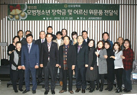 신호장학회(회장 조남형)는 21일(금) JK아트컨벤션 4층에서 ‘제15회 모범 청소년 장학금 및 어르신 위문품 전달식’을 열고 어려운 가정환경으로 학업에 어려움을 겪고 있는 관내 중∙고등학생들에게는 장학금을 어려운 어르신들에게 이불 등 겨울용품을 전달했다.