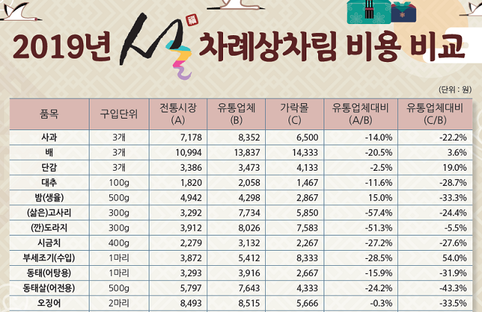 서울시농수산식품공사(사장 김경호, 이하 공사)는 서울 시내 25개 구 전통시장, 대형마트 및 가락시장 내 가락몰 등 총 76곳을 대상으로 2019년 설 차례 상차림 비용을 조사해 24일 ․발표한 내용에 따르면 이같이 나타났다. 공사는 지난 1월 15일~16일(이틀간) 서울시 물가조사 모니터단 25명의 협조를 받아 서울 시내 전통시장 50곳, 대형마트 25곳 등을 직접 방문하여 주요 설 성수품 소매비용을 조사하였다. 올해는 조사대상 대형마트를 10곳에서 25곳으로 확대해 조사했다.