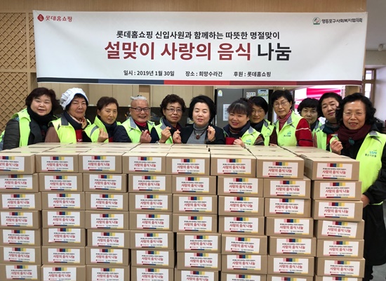 소외계층이 따뜻한 설 명절을 보낼 수 있도록 설맞이 음식을 만들어 영등포구사회복지협의회 좋은 이웃들 봉사자 10명, 롯데홈쇼핑 지원본부장을 비롯한 신입사원 21명이 따뜻한 마음을 모아 정성껏 만든 음식을 롯데홈쇼핑 직원들이 직접 쓴 손편지와 함께 전달되었다. 설맞이 음식 나눔 봉사활동에 참여한 좋은이웃들 봉사자는 “어려운 이웃에 대한 관심과 사랑으로 준비한 음식을 드시는 모든 분께 따뜻한 마음으로 전해지기를 바라며, 앞으로도 음식 나눔 봉사활동으로 주변의 어려운 이웃들에게 도움을 주고 싶다”고 전했다. 이번 나눔 봉사활동은 롯데홈쇼핑이 2015년부터 영등포구사회복지협의회와 함께해온 ‘희망수라간’ 사업의 일환으로 진행됐다.