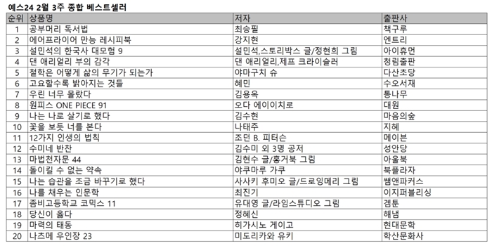 초·중등 학부모를 위한 독서교육 지침서 ‘공부머리 독서법’이 한 계단 오르며 2월 3주 종합 베스트셀러 1위에 올랐다. 이어 인기 블로거 ‘겨울딸기’의 에어프라이어를 이용한 초간단 조리법을 담은 <에어프라이어 만능 레시피북>이 열한 계단 가파르게 오르며 2위를 기록했다. 예스24가 21일(목) 발표한 2월 3주 종합 베스트셀러 발표에 따르면 이같이 나타났다. 또 3.1운동 100주년을 맞아 독립운동의 발자취를 담아낸 <설민석의 한국사 대모험 9>은 열다섯 계단 성큼 올라 3위를 차지했다. 돈에 대한 의사결정을 행동경제학의 관점에서 살펴본 <댄 애리얼리 부의 감각>이 4위로 새롭게 순위권에 얼굴을 내밀었으며 일본에서 가장 주목받는 전략 컨설턴트가 전하는 50가지 생각 도구 <철학은 어떻게 삶의 무기가 되는가>는 전주 대비 두 계단 내려간 5위다. 오랜 기간 동안 독자들의 두터운 관심을 받는 만화들이 순위권에 다수 포진했다. 1997년 연재를 시작해 무려 20여 년간 전 세계 팬들에게 인기를 얻고 있는 만화 <원피스 ONE PIECE 91>은 세 계단 오른 8위를 기록했고 어린이들의 한자 학습과 학습만화 열풍을 이끈 ‘마법천자문’ 시리즈의 신간 <마법천자문 44>는 세 계단 내려간 13위에 안착했다. 게임 ‘좀비고등학교’의 동명 학습만화 <좀비고등학교 코믹스 11>과 요괴를 볼 수 있는 비밀 소년의 이야기를 그린 일본 만화 <나츠메 우인장 23>은 각각 17위, 20위를 차지하며 새롭게 순위권에 얼굴을 내밀었다. 독자들의 마음과 삶을 조명한 인문서에 대한 열기도 지속하고 있다. 전 하버드대 심리학과 교수 조던 피턴슨의 신간 인문서 <12가지 인생의 법칙>은 세 계단 내려간 11위를 차지했고 각 분야 석학들이 삶과 관련된 주제에 따라 직접 선별한 도서를 시리즈로 소개하는 <나를 채우는 인문학>이 16위로 새롭게 순위권에 모습을 드러냈다.