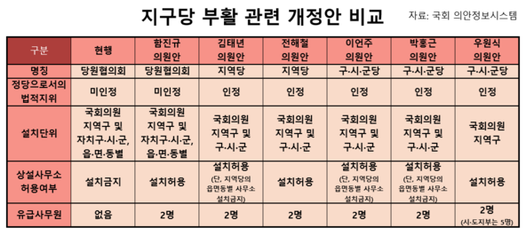 내용을 구체적으로 살펴보면 함진규 의원 안은 당원협의회에 사무소와 2명 이내 사무직원을 둘 수 있도록 하자는 내용이다.