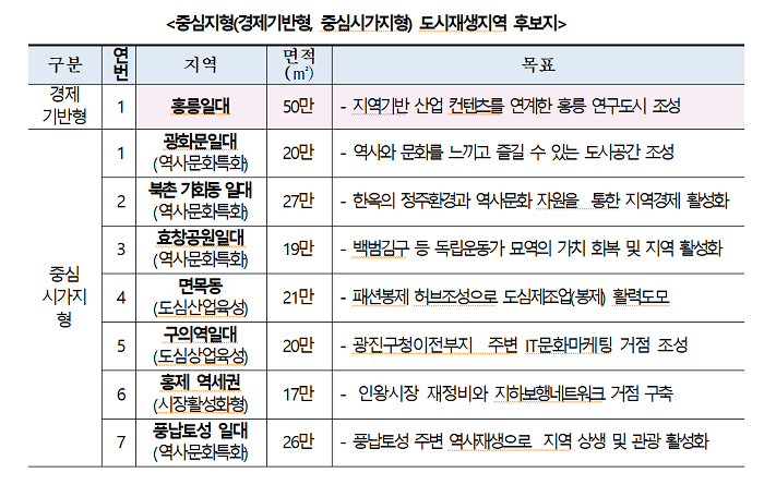 서울시는 홍릉 일대 등 新경제거점조성 및 산업․상업․역사문화 중심지 육성을 위해 신규 도시재생지역 후보지 8개소를 선정하고 8월에 평가를 시행해 도시재생활성화지역으로 최종 선정한다.