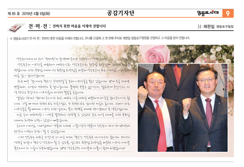 영등포시대가 전∙마∙전 : 전하지 못한 마음을 이제야 전합니다. 코너를 신설해 그 첫 번째 주자로 채현일 영등포구청장을 선정하고 그 마음을 받아 전합니다.