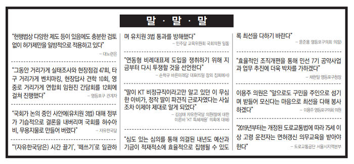 -대노련은 “그동안 거리가게 실태조사와 현장점검 47회, 타구 거리가게 벤치마킹, 현장답사 견학 10회, 영중로 거리가게 연합회 임원진 간담회를 12회에 걸쳐 진행했다” -영등포구 관계자 “국회가 논의 중인 사안에(유치원 3법) 대해 정부가 기습적으로 결론을 내버리며 국회를 허수아비, 무용지물로 만들어 버렸다” -자유한국당 “‘(자유한국당은) 시간 끌기’, ‘떼쓰기’로 일관하며 유치원 3법 통과를 방해했다” -민주당 교육위원회 국회의원 일동 “연동형 비례대표제 도입을 쟁취하기 위해 지금부터 다시 투쟁할 것을 선언한다” 손학규 바른미래당 대표(15일 장외 집회에서) “딸이 KT 비정규직이라고만 알고 있던 이 무심한 아비가, 정작 딸이 파견직 근로자였다는 사실조차 이제야 제대로 알게 되었다” -김성태 자유한국당 의원(딸에 대한 이른바 ‘KT 특혜채용’ 의혹에 대해) “심도 있는 심의를 통해 의결된 내년도 예산과 기금이 적재적소에 효율적으로 집행될 수 있도록 최선을 다하기 바란다” -윤준용 영등포구의회 의장 “효율적인 조직개편을 통해 민선 7기 공약사업과 업무 추진에 더욱 박차를 가하겠다” -채현일 영등포구청장 “앞으로도 구민을 주인으로 섬기며 받들어 모신다는 마음으로 최선을 다해 봉사하겠다” -이용주 영등포구의회 의원 “경제상황으로 인해 취약계층이 더욱 어려워질 수 있다” -안승대 서울시 민생사법경찰단장 “2019년부터는 개정된 도로교통법에 따라 75세 이상 고령 운전자는 면허갱신 의무교육을 받아야 한다” -도로교통공단 서울시지역본부