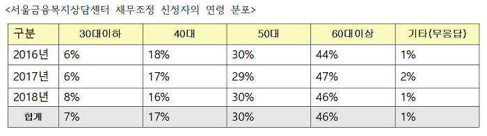 2013년부터 이뤄진 집계 결과, 채무조정 지원이 필요하다고 판단된 5,379명의 시민은 개인파산면책(5,166명)과 개인회생(213명)의 형식으로 센터의 지원을 받았다. 특히 2016년부터 3년간 채무조정 서비스를 받은 시민 3,224명 중 ‘월평균 소득 100만 원 이하’라고 밝힌 이들의 비율은 90%에 달했다. 도저히 빚을 갚을 수 없는 한계상황에 다다른 시민이 채무조정 상담을 요청한 것이다. 채무조정자의 부채 발생 사유로는 주거‧의료‧교육비 등의 지출로 발생한 생활비 마련(45.56%) 비중이 가장 높았고, 사업자금 마련(29.18%), 보증채무(9.05%)가 그 뒤를 이었다. 연령 분포로는 60대 이상이 46%, 50대가 30%에 달했다. 이를 통해 퇴직이나 고령으로 인해 소득 활동이 어려운 시민의 채무조정 서비스 이용도가 높았음을 알 수 있다.