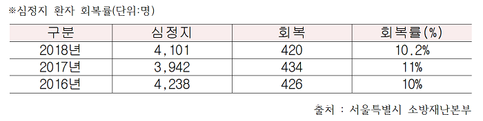 2018년 심정지 환자 4,101명 중 420명 회복 서울시에서 최근 3년간 발생한 심폐소생술 시행 환자는 2016년 4,238명, 2017년 3,942명, 2018년 4,101명으로 이 가운데 소생한 환자는 2016년 426명(10%), 2017년 434명(11%), 2018년 420명(10.2%)으로 3년 평균 소생률은 10.4%를 보인다.