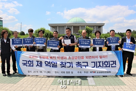 소상공인연합회 회원들이 11일 오후 국회 정문 앞에서 “국회 제 역할 찾기 촉구 기자회견”을 외친 뒤 외친 구호다. 소상공인연합회는 이날 기자회견을 통해 “소상공인인 도탄에 빠져 있다”며 “서민 경제를 위해 민생 국회의 모습 보여야 한다”고 강조하고 “올해 들어 국회는 유명무실한 모습을 보이고 있다”고 비판했다. 국회 공전 사태가 장기화하면서 올해 들어 법안 처리를 위한 국회 본회의는 단 사흘 열렸고, 4월 이후 민생법안은 단 한 건도 처리되지 못하고 있다. 소상공인연합회는 “추경안을 비롯하여 수없이 많은 민생 현안과 지역 현안은 물론, 시급한 소상공인 현안마저 논의조차 안 되는 상황이다”고 꼬집고 “소상공인들의 염원인 소상공인 기본법, 최저임금 결정구조 개편 방안” 등을 열거하고 “내년 총선을 앞두고 정치권이 각자의 유리한 측면을 위해 힘겨루기를 하는 동안 정작 민생은 뒤로 밀리고 소상공인과 서민들은 힘겨운 상황으로 내몰려 있다”고 주장했다. 선거 때마다 정치인들은 소상공인들을 위해 일한다고 약속하지만, 정작 국회에 들어가면 소상공인들을 나 몰라라 하고 돌보지 않는 현실은 국회가 과연 국민의 대의기관의 역할을 다하고 있는지 의문마저 들게 하고 있다. 소상공인연합회는 “내년 총선만 염두에 두고 일도 안 할 거면 차라리 지금 아예 국회를 해산하여 본인들이 그렇게도 신경 쓰는 선거를 치르라고 말하고 싶은 것이 오늘날 소상공인들의 솔직한 심정이다”고 밝히고 “여야 모든 정당이 민생을 위해 하나 되어 시급히 민생 국회를 통해 민생 현안 논의에 나서며 일하는 국회의 모습을 보일 것”을 강력히 촉구했다. 소상공인연합회는 “민생 국회를 촉구하는 소상공인들과 서민의 민심을 국회에 전달하기 위해 각 당 원내대표를 순차적으로 예방에 나설 것이다”고 밝혔다.
