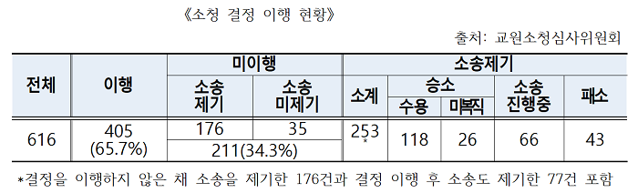 교원소청 심사는 교원이 학교로부터 징계처분 또는 의사에 반하는 불리한 처분을 받았을 때 취소·변경을 요청하는 제도로 교원소청위가 그 심사를 맡고 있다. 현행 교원지위법과 행정소송법에 따라 학교는 교원소청위의 결정에 따라야 하지만, 일부 학교에서는 행정소송을 빌미로 교원소청위 결정을 이행하지 않고 있는 것으로 확인됐다. 신경민 의원은 “지난해 8월 교육부 업무보고에서 이와 같은 사실을 지적하고, 소청 결정 처분 실태점검을 요청했다”면서 “교육부와 교원소청위 조사 결과 2013년 1월 1일부터 2018년 8월 31일까지 진행된 소청심사 인용 결정은 616건으로 확인되었다”고 밝혔다. 신경민 의원은 “이 중 405건은 소청 결정을 이행하였으나, 211건은 이행하지 않은 것으로 나타났다. 211건 중 35건은 쌍방합의 등의 방식으로 소송도 제기하지 않은 채 미복직 처리되어 사실상 권리구제의 효과가 미미했다”며 “26건은 교원소청위가 승소하였음에도 이행하지 않고 있어 총 61건의 사안에서 권리구제의 실익이 없었던 것으로 드러났다”고 밝혔다.