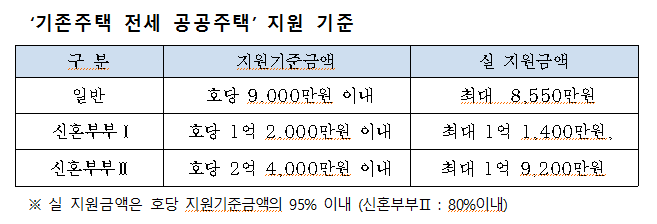 2,389명 가운데 일반(저소득층) 대상자는 2,000명, 신혼부부Ⅰ(전년도 도시근로자 월평균소득의 70% 이하)은 289명, 신혼부부Ⅱ(전년도 도시근로자 월평균소득의 100% 이하)는 100명이다. 신혼부부 전세임대 입주대상자 선정이 완료되지 않은 일부 자치구의 경우 7월 경 발표 예정이다. 서울시가 신혼부부 등 무주택 시민이 거주를 원하는 주택을 직접 물색해 신청하면 시가 전‧월세 보증금의 95%를 저금리로 지원하는 ‘기존주택 전세 공공주택’ 올해 입주자 2,389명을 선정 완료, 28일(금) 18시 서울주택도시공사 홈페이지(http://www.i-sh.co.kr)를 통해 발표한다. ‘기존주택 전세 공공주택’(기존주택 전세임대주택)은 입주대상자가 주택을 물색해 서울주택도시공사에 신청하면 → 서울주택도시공사에서 전세 가능 여부를 검토 후 계약자가 되어 주택소유자와 전세계약을 체결하고 → 이를 다시 입주대상자에게 저렴하게 재임대하는 방식의 공공주택이다. 계약 시 서울주택도시공사가 가구당 9천만 원 이내에서 전‧월세 보증금의 95%를 저금리로 지원하고, 나머지 5%는 입주자가 계약금으로 내게 된다. 전‧월세 보증금이 9천만 원을 넘을 경우 초과보증금을 입주자가 부담하면 된다.