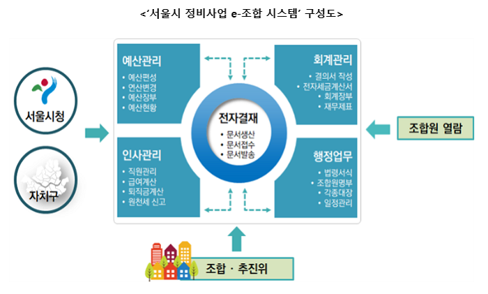 서울시 교육, 시스템 적응기간 거쳐 조기정착, 100% 사용 유도 과거 수기로 작성됐던 예산, 회계, 계약대장, 급여 관리 등 재개발‧재건축 조합에서 생산되는 모든 문서가 전자결재를 통해 100% 전자화되고, 조합원들에게 온라인으로 실시간 공개되는 ‘정비사업 e-조합 시스템’이 현재 서울 시내 전 373개 구역 중 363개 구역에서 사용, 약 97%가 활용하고 있는 것으로 나타났다.