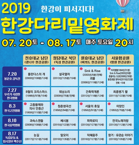 서울시 한강사업본부는 7월20일부터 8월17일까지 매주 토요일 저녁 8시에 한강 다리밑 3곳과 망원 서울함공원에서 ‘2019 한강 다리 밑 영화제’를 개최한다고 밝혔다. 개최장소는 광나루 천호대교(남단), 뚝섬 청담대교(북단), 여의도 원효대교(남단), 망원 서울함공원이다. 2017년까지 개최장소였던 성산대교는 성능 개선공사로 인해 장소를 변경해 진행한다. 올해는 한국영화 탄생 100주년과 대한민국 임시정부 수립 100주년을 기념하고 올해 초 프랑스 칸 영화제에서 황금종려상을 수상한 봉준호 감독의 특별전을 마련해 한국영화 특집으로 구성했다. 5주간 각 주차 별 주제에 따른 총 23편의 영화를 무료로 상영한다. 1주 차 7월20일에는 한강과도 특별한 인연이 있는 봉준호 감독 특별전이 열린다. ‘플란다스의 개’(천호), ‘설국열차’(청담), ‘싱크 앤 라이즈’ 와 ‘괴물’(원효), ‘지리멸렬 외 단편 특선’(망원 서울함공원)을 상영한다. 특히 영화의 배경이 된 여의도한강공원에서 상영되는 ‘괴물’은 꼭 관람해보길 추천하며, 영화의 시초가 된 ‘싱크 앤 라이즈 (Sink & Rise)’를 함께 상영하여 재미를 더 해줄 예정이다.